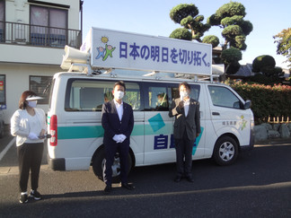 こんにちは 増田ひとし通信です。9月19日(日)午後、内閣府副大臣三ツ林ひろみ衆議院議員の街頭演説を町内各地で開催された。また、自民党街宣車あさかぜで町内全域にわたって、国政報告をさせていただいた。コロナ禍の非常事態宣言下でもあり、当初予定していたJAさいかつでの国政報告会は2度のわたって中止となったが、ローソン松伏店様、マスナオ様、新都市開発様駐車場をお借りし、また、スーパーのジョイフーズ様近くで、三ツ林副大臣の埼玉14区や松伏町に関する取り組み、また、コロナ感染防止対策の進捗、地方創生の国の取り組みなどの報告がなされた。