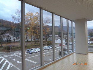 ① 東京大学堀先生からアドバイスを頂き、駐車スペースより古民家風の建物と日本庭園風の池などの外観を重視したデザインとなっている。館内に足湯があり、また温泉が隣接しておりスキー客など国道